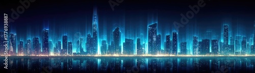 © PBMasterDesign, Obraz premium Futuristic skyscraper wireframe with digital complexity concept. Futuristic city skyline illuminated by vibrant neon lights.