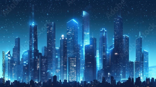 © Jersco, Fototapeta premium Futuristic skyscraper with glass facades reflecting the city skyline.