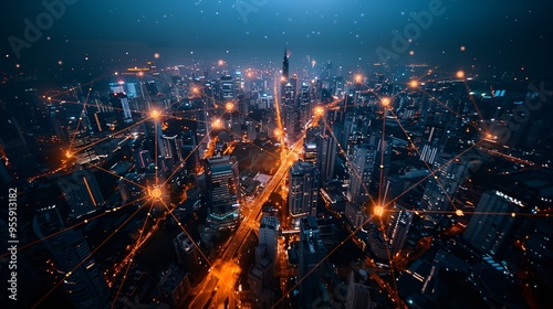 Fototapeta premium Futuristic Smart City Connected by a Digital Network of Lines and Nodes, Representing Global Internet Connectivity, Data Exchange, and Advanced Communication Technologies.