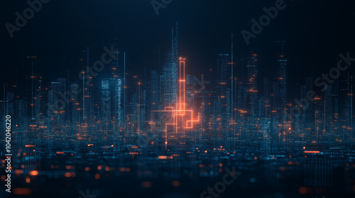 © Kingdola, Naklejka premium Futuristic smart city filled with wifi signals, network hubs glowing, buildings connected through visible data streams, digital innovation