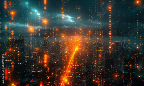 © Bartek, Obraz premium Futuristic Smart City in Metaverse: A Hub of Technology, Innovation, and Advancement at Night with Cyber Elements and Glowing Data Streams