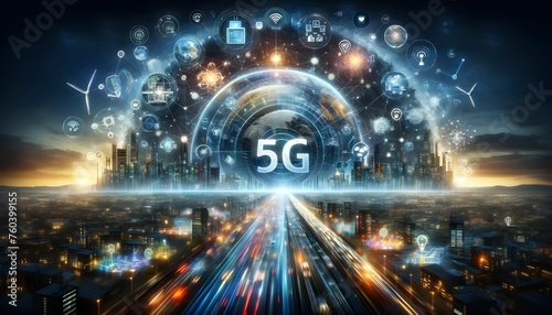 © SUPHAPHONNOINONGHWA, Obraz premium Futuristic Smart City with 5G Network Technology generative AI