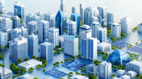 Obraz premium Futuristic smart city with high-rise buildings, renewable energy sources, and green spaces, showcasing advanced urban planning and sustainability.