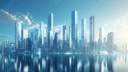 © 69, Fototapeta premium Futuristic smart city with towering skyscrapers and sleek architecture, representing a modern financial district.
