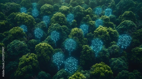 © Warakorn, Obraz premium Futuristic smart forest with AI-driven technology optimizing carbon offset and conservation strategies
