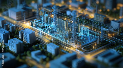 © AGCreative, Obraz premium futuristic smart grid technology landscape showcasing electrical infrastructure with glowing elements. scene captures essence of modern energy solutions in urban setting