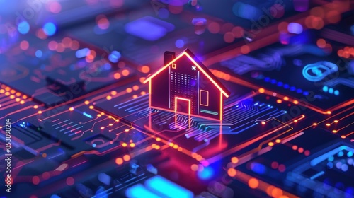Obraz premium Futuristic smart home concept with digital house icon glowing on a circuit...