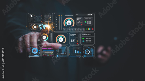 Fototapeta premium Futuristic Smart Home Dashboard Interface, Sleek, interactive interface smart home data and analytics, illuminated against dark background, emphasizing technologys role in modern living