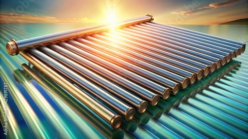 Fototapeta premium Futuristic solar energy collector array gleaming at sunset, reflecting the...