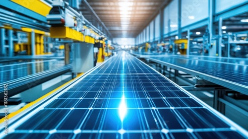 Fototapeta premium Futuristic Solar Panel Manufacturing Facility with Advanced Production Lines Under Bright Industrial Lighting Showcasing Clean Energy Technology and Innovation