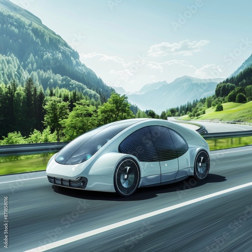Fototapeta premium Futuristic Solar-Powered Car on Open Road - Concept of Renewable Energy in...