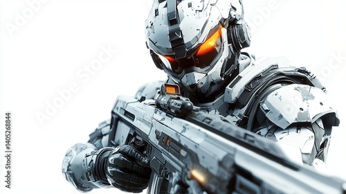 © Elang, Fototapeta premium Futuristic soldier aiming rifle, white background.