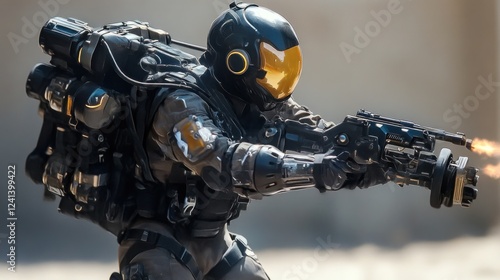 Fototapeta premium Futuristic Soldier in Action: Jetpack and Advanced Weaponry