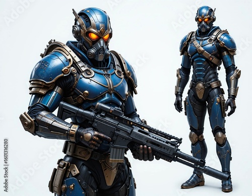© Sufia Begum, Fototapeta premium Futuristic soldier in blue armor with sniper rifle