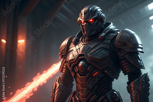 Fototapeta premium Futuristic soldier in dark armor firing energy weapon warrior sci-fi