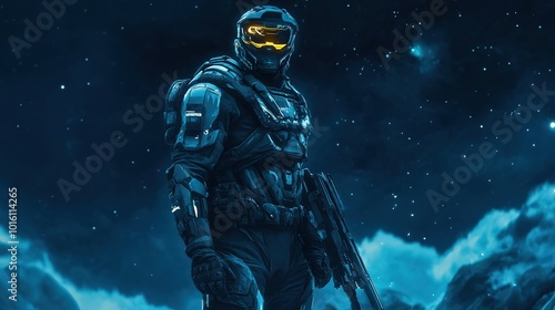 Fototapeta premium Futuristic soldier stands against a vibrant cosmic backdrop with streaks of...