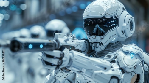 © sirisakboakaew, Fototapeta premium Futuristic Soldier with Modern Tech Weapons