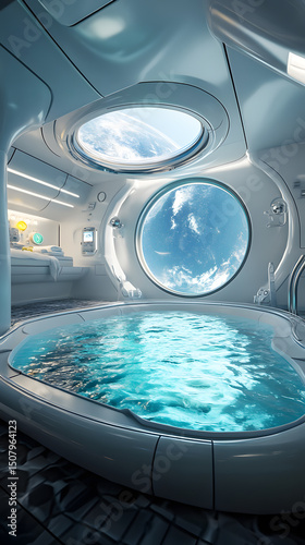 Obraz premium futuristic spa featuring pool and windows offering view of Earth from space, relaxation and luxury.