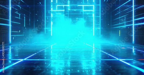 Fototapeta premium Futuristic space. Bright neon lines create tunnel effect. Blue light dominates, smoke fills central area. Minimalist design, digital aesthetic.
