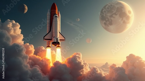 Fototapeta premium Futuristic space shuttle blasts off on mission to explore distant planets and moons