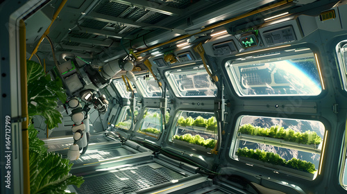 © Sheikh, Obraz premium Futuristic space station hydroponic garden cultivating fresh greens with Earth visible through windows