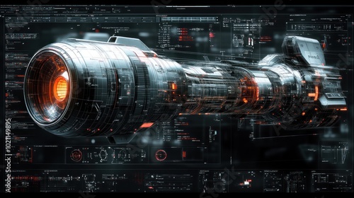 Obraz premium Futuristic spacecraft design with glowing elements and data overlays.