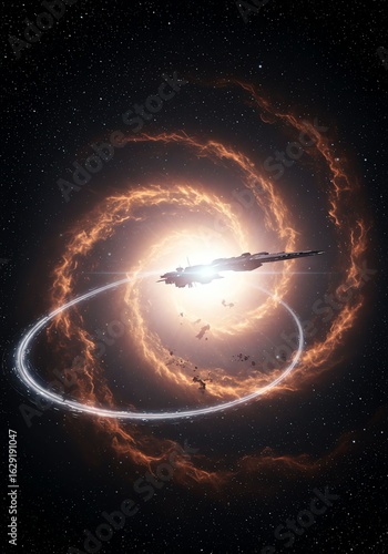 Obraz premium Futuristic Spacecraft Flying Near Bright Cosmic Explosion with Nebula and Stars