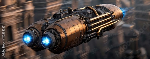 © Jiraporn, Fototapeta premium Futuristic spacecraft with glowing engines flying above a cityscape.