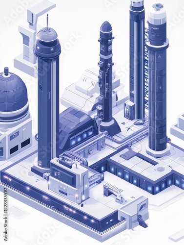 © Richafuji, Obraz premium Futuristic Spaceport Isometric Illustration: A Detailed View of a Modern Space Launch Facility.