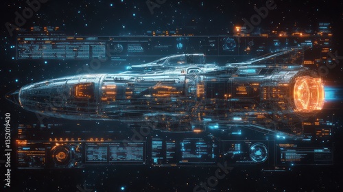© Ari, Obraz premium Futuristic Spaceship: A digital rendering of a sleek, high-tech spaceship, glowing with vibrant orange and blue energy signatures against a backdrop of stars.