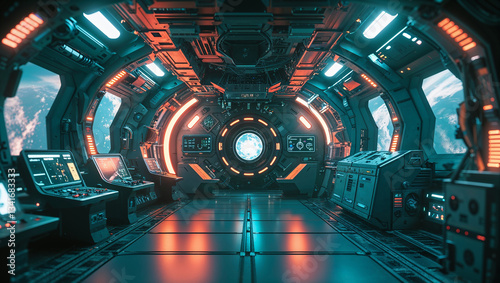 Fototapeta premium Futuristic spaceship bridge with view of planet earth orbiting in space