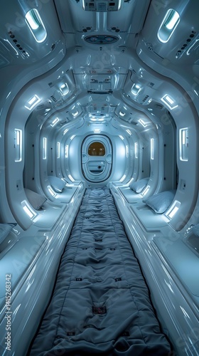Fototapeta premium Futuristic Spaceship Cabin Interior Design with Sleek Pods and Comfortable Bedding