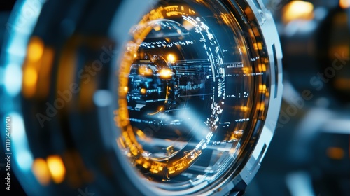 Obraz premium Futuristic spaceship cockpit showing a circular display with holographic projections of data, complex information and indicators, creating a high tech and immersive atmosphere