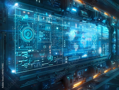 © ngstock, Obraz premium Futuristic spaceship control panel with a large world map.