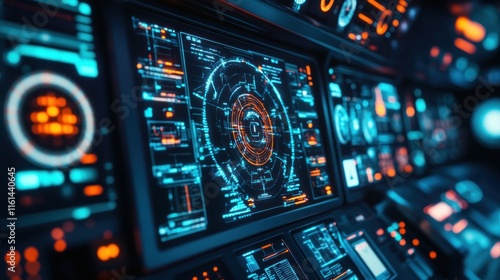 Fototapeta premium Futuristic spaceship control panel with glowing blue and orange digital displays and interfaces.