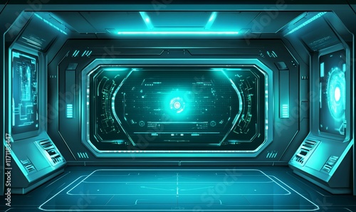 Obraz premium Futuristic spaceship control room with glowing screens and data interface