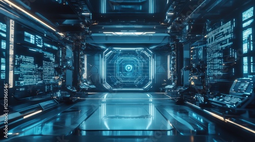 © Mnur, Obraz premium Futuristic Spaceship Corridor Displays Advanced Technology