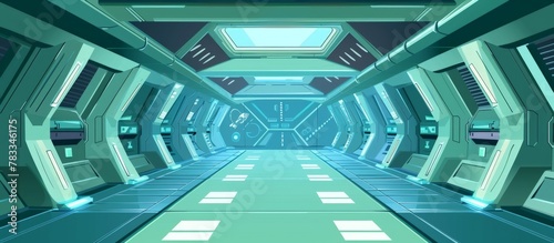 Naklejka premium Futuristic spaceship corridor featuring a vibrant green floor and high-tech...