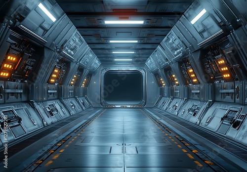 Fototapeta premium Futuristic Spaceship Corridor Sci Fi Interior Metal Walls Lights