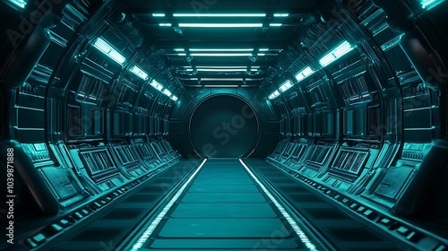 Fototapeta premium Futuristic Spaceship Corridor with Teal Lighting