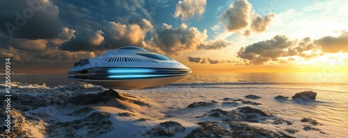 Obraz premium Futuristic spaceship hovering over beach at sunset with dramatic clouds