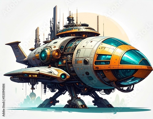 Obraz premium Futuristic spaceship illustration white orange and teal spacecraft design...