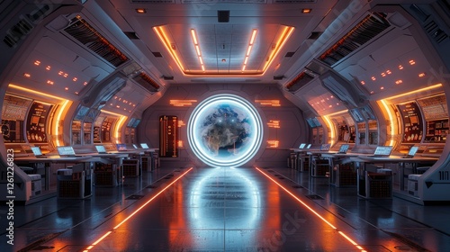 © Sob65, Fototapeta premium Futuristic spaceship interior with Earth view.