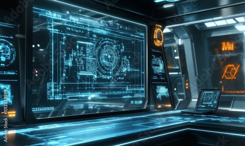 Obraz premium Futuristic spaceship interior with glowing displays.