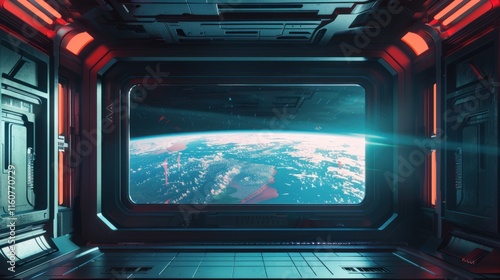 Obraz premium Futuristic spaceship interior with view of Earth from porthole.