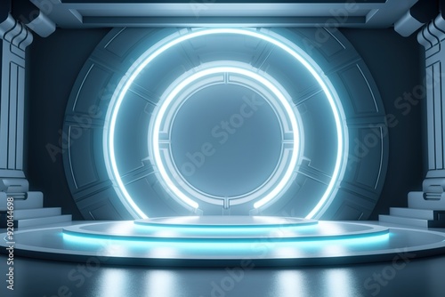 © hfwstudio, Obraz premium Futuristic stage with neon light and circular platform.
