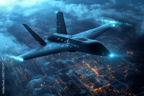 © Rosshahizal Amri, Obraz premium Futuristic stealth aircraft flying over city at night