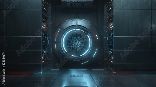 Fototapeta premium Futuristic steel vault door with glowing lights in a high-tech facility,...