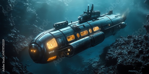 Obraz premium Futuristic submarine exploring deep ocean. Illuminated vessel navigating...