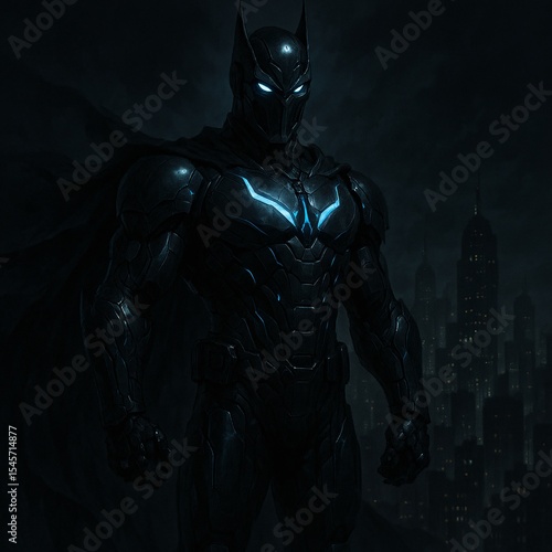 Fototapeta premium Futuristic Superhero in Majestic Full-Body Armor Against Night Cityscape
